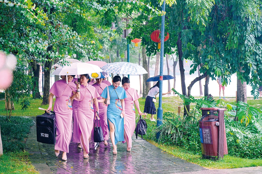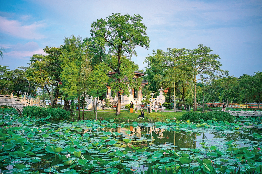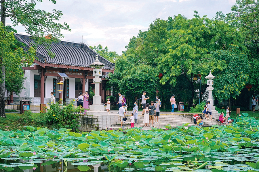 “映湖光,逞新妝!蔽骱系呢S渚園夏日風(fēng)景漸入佳境,見淵亭橋附近的荷花已展風(fēng)姿,園內(nèi)處處被綠色裝點(diǎn),引人入勝。