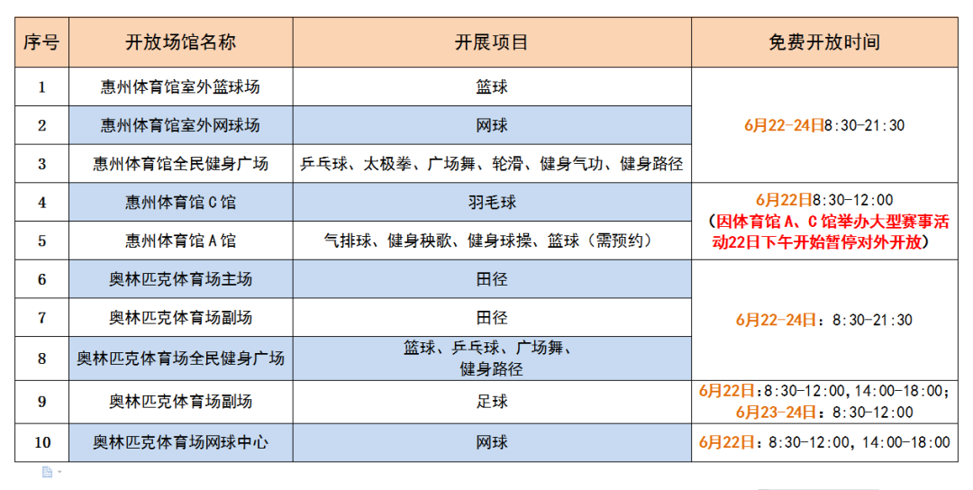 注:端午節(jié)期間因惠州體育館(A、C館)舉辦大型賽事活動,22日下午開始暫停對外開放: