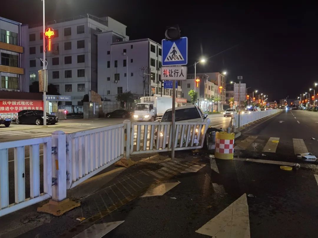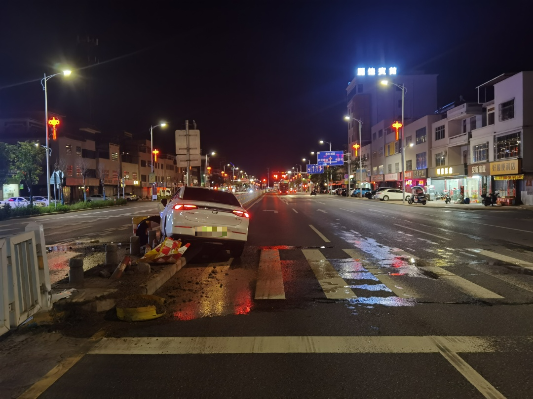 6月12日1時(shí)許,夜深人靜;輺|縣公安局交警大隊(duì)白花中隊(duì)門(mén)外馬路上突然傳來(lái)“嘭”的一聲巨響,執(zhí)勤民警循聲外出,看見(jiàn)一部小車(chē)撞到了道路中間隔離護(hù)欄。