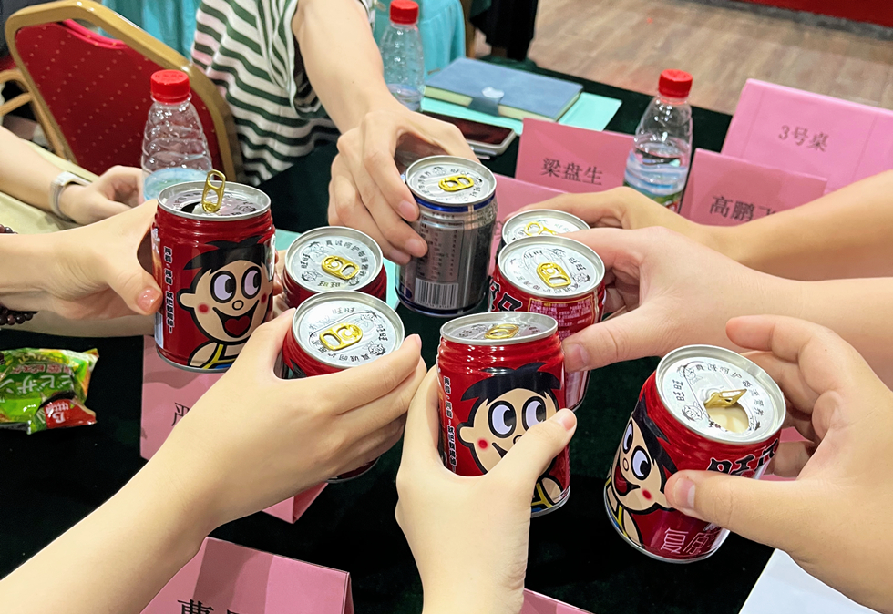 “乘風破浪”隊用獎勵的旺仔牛奶碰杯慶賀。