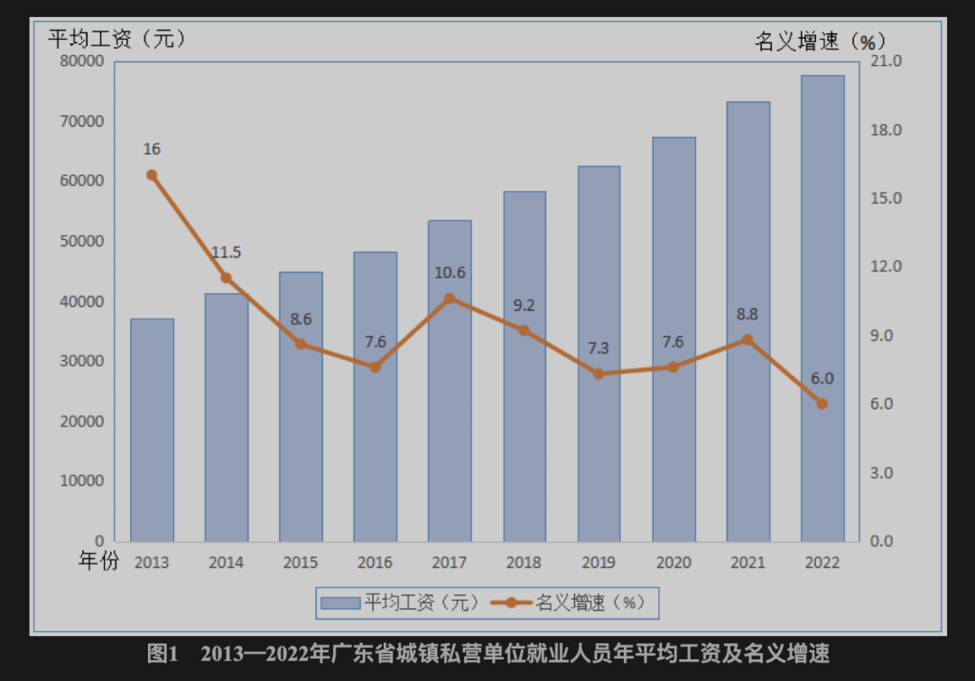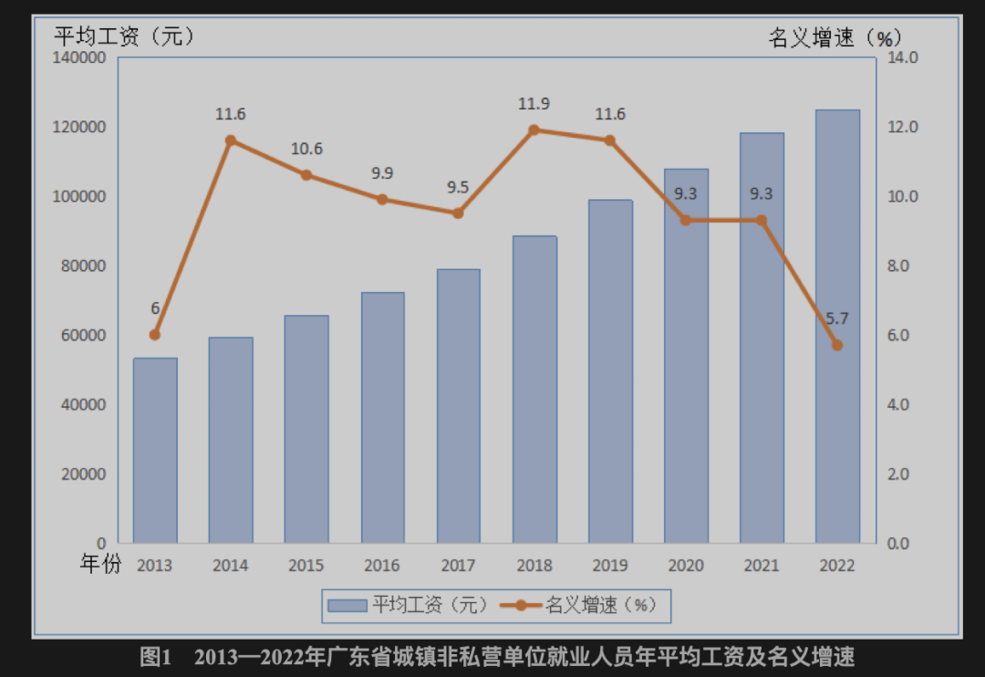 2022年,廣東省城鎮(zhèn)非私營單位就業(yè)人員年平均工資124916元,比2021年增加6783元,名義增長5.7%,增速比2021年回落3.6個百分點,扣除價格因素實際增長4.5%;