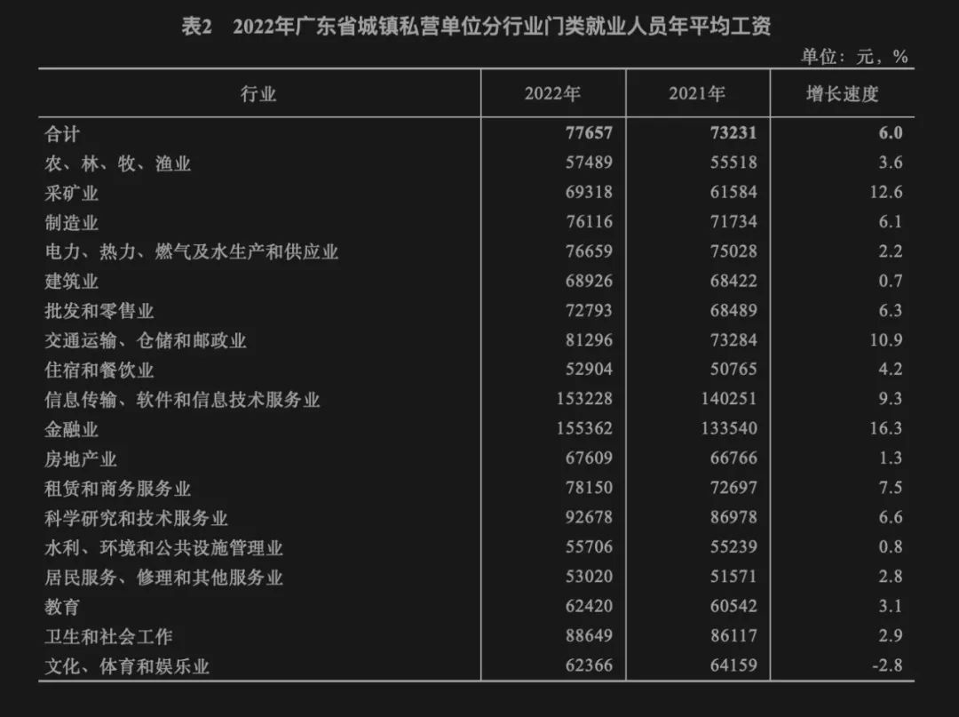 2022年,在廣東城鎮(zhèn)私營單位的18個行業(yè)門類中,有17個行業(yè)門類就業(yè)人員平均工資保持增長,金融業(yè)平均工資水平和增速均位居第一。城鎮(zhèn)非私營單位的19個行業(yè)門類中,有15個行業(yè)的就業(yè)人員平均工資保持增長。其中采礦業(yè)平均工資漲幅最大,增長21.7%。