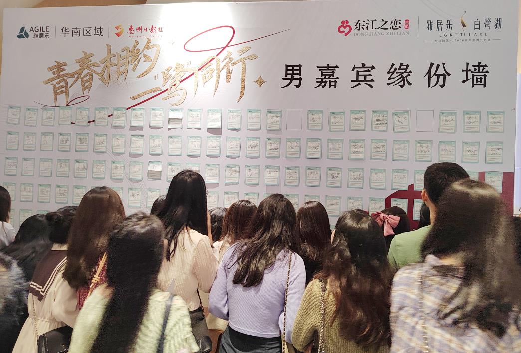 惠州日?qǐng)?bào)旗下的“惠報(bào)·東江之戀”近期組織的8場(chǎng)婚戀交友活動(dòng),吸引超過(guò)千人參與,這是活動(dòng)現(xiàn)場(chǎng)中的男嘉賓緣婚墻。
