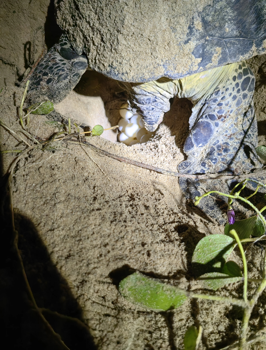 當(dāng)天凌晨,母海龜從海里悄悄爬上沙灘,用健壯的四肢在沙灘上挖了個坑,趴著產(chǎn)下一窩龜?shù)昂螅智那耐@锱廊ィ?時30分消失在浪潮里。
