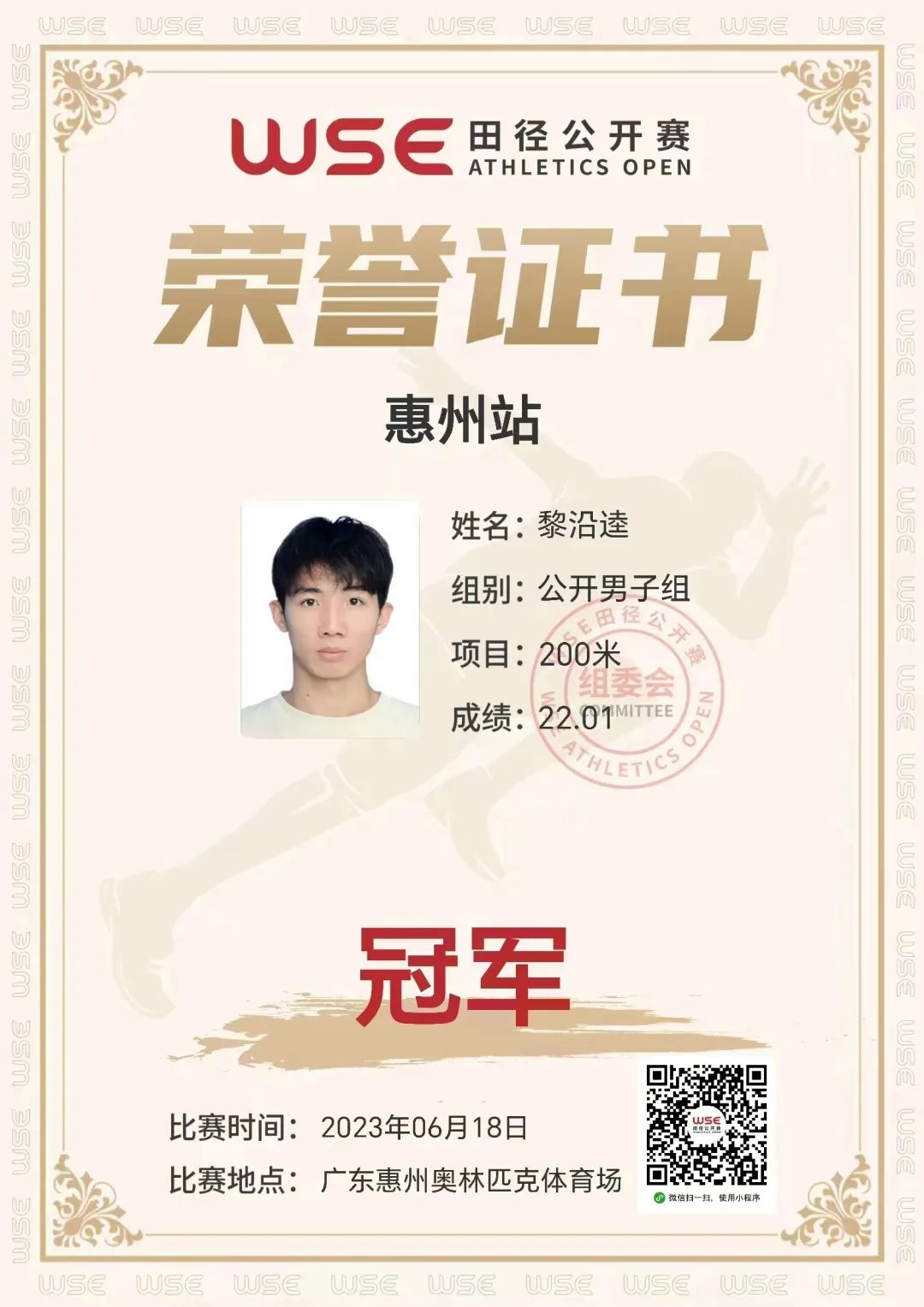 近日,2023中國大眾達標系列賽暨WSE田徑公開賽(惠州站)在惠州市奧林匹克體育中心體育場舉辦;葜葸\動員黎沿逵在公開組100m、200m賽事斬獲金牌,并達國家一級運動員標準。