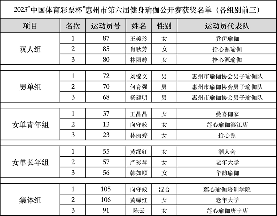 惠州市第六屆健身瑜伽公開(kāi)賽獲獎(jiǎng)名單(各競(jìng)賽項(xiàng)目?jī)H公示前三名)。