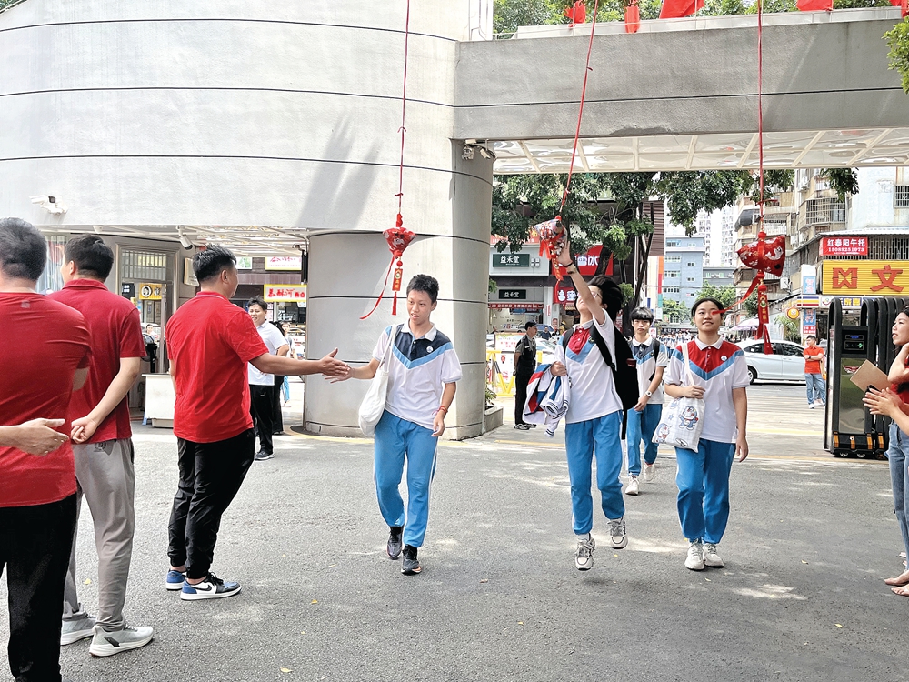 在惠州市第八中學(xué)考點,老師們身著紅色上衣,在校門口分列迎接考生。學(xué)校還在校門口懸掛寓意“一舉高中”的粽子,每位考生經(jīng)過都摸一下,討個好彩頭。老師們還逐一與考生擊掌,為他們加油打氣。