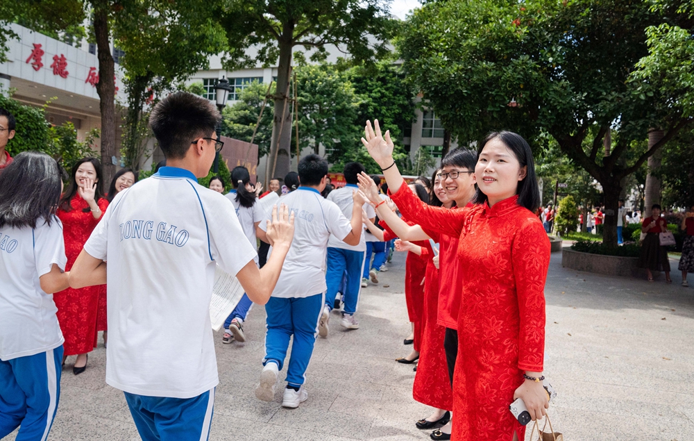 赴考前,惠州市綜合高級中學(xué)老師們?yōu)槊總學(xué)生送上寫有“金榜題名”的紅包,祝福他們考出好成績。在送學(xué)生們奔赴考場時,老師們或穿旗袍,或披紅衣,希望孩子們旗開得勝,取得開門紅。
