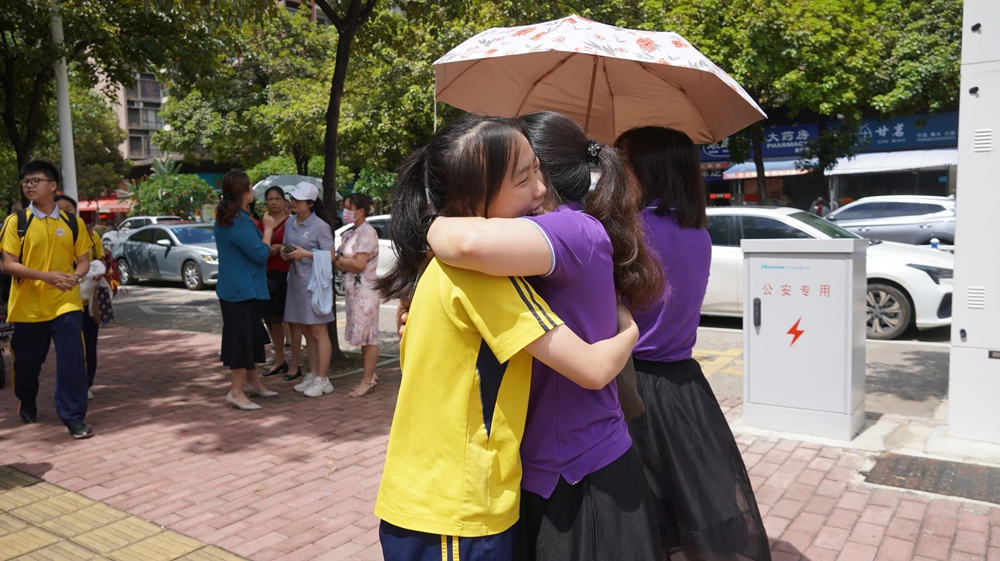 惠州市惠城區(qū)金石學(xué)校老師在考點外與考生擁抱。