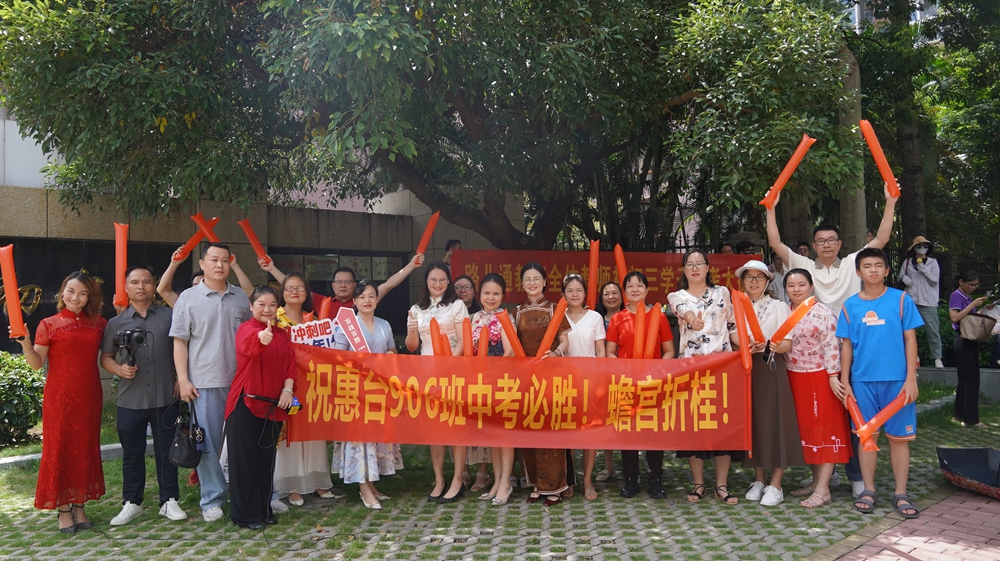 惠州市合生實驗學(xué)校老師為考生鼓勁。