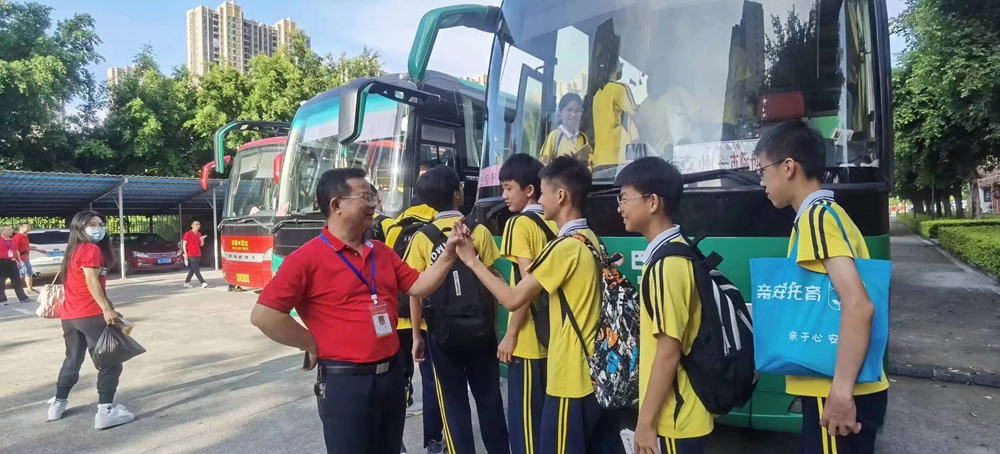 惠州市合生實驗學(xué)校的考生們今年在惠州市惠城區(qū)尚書實驗學(xué)?键c考試。昨日,學(xué)校特意安排了幾輛大巴車,將考生們集體送往考點!凹佑!”出發(fā)前,學(xué)校領(lǐng)導(dǎo)和老師們統(tǒng)一身穿紅色衣服,排隊一一與每一位考生擊掌,為他們加油打氣。