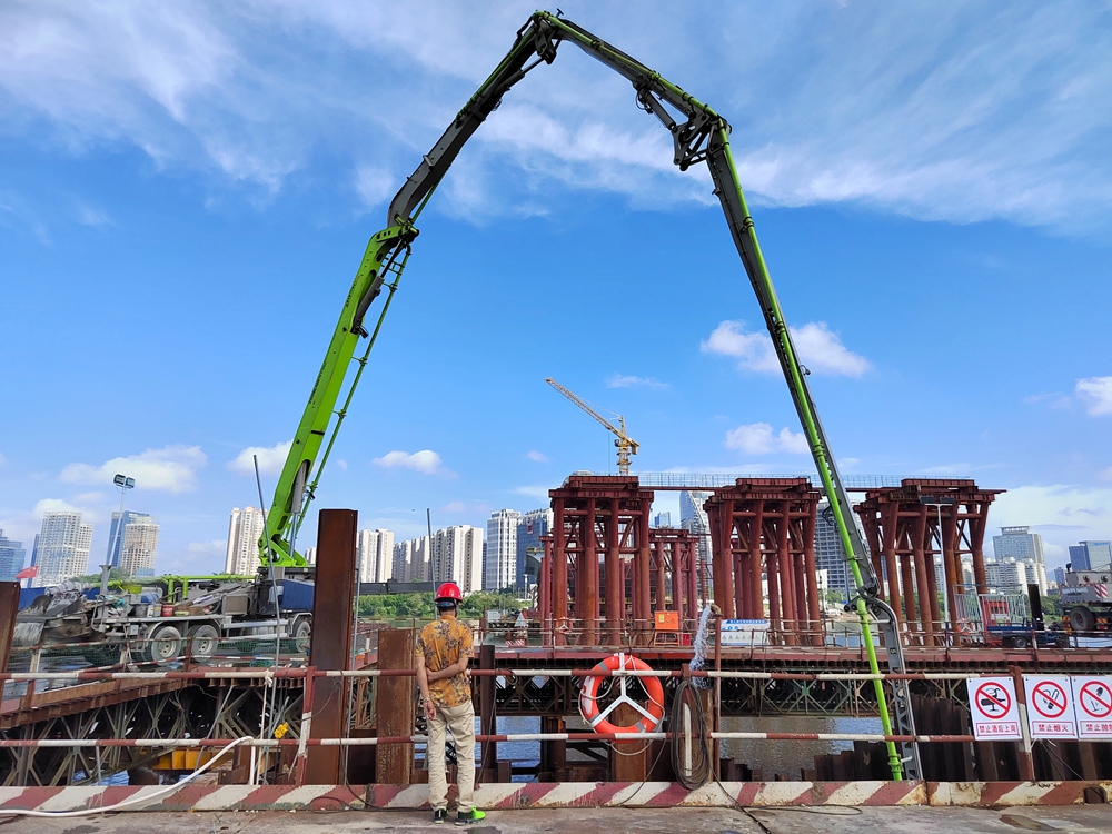 此次澆筑的承臺位于東江東岸,采用21米鋼板樁圍堰施工,圍堰插入水下沙卵層10米,施工難度較大。為確保順利澆筑,項目部組織召開承臺澆筑技術(shù)交底。澆筑前,從攪拌站混凝土質(zhì)量、配比控制、運(yùn)輸能力、澆筑管控、后勤保障等方面進(jìn)行周密安排,確保澆筑萬無一失。澆筑過程中,施工人員采取不間斷施工,技術(shù)人員全程盯控,歷時16小時完成澆筑。目前,鵝城大橋橋樁基、承臺已全部完成,墩身和架梁在同步施工中。