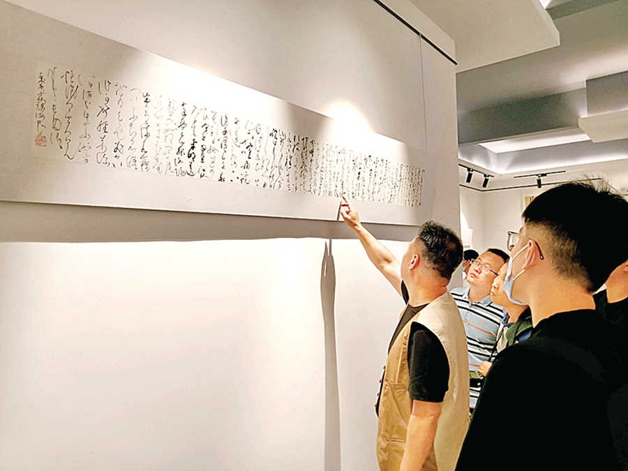 參加活動(dòng)的書法家和書法愛(ài)好者們一邊參觀一邊學(xué)習(xí)。