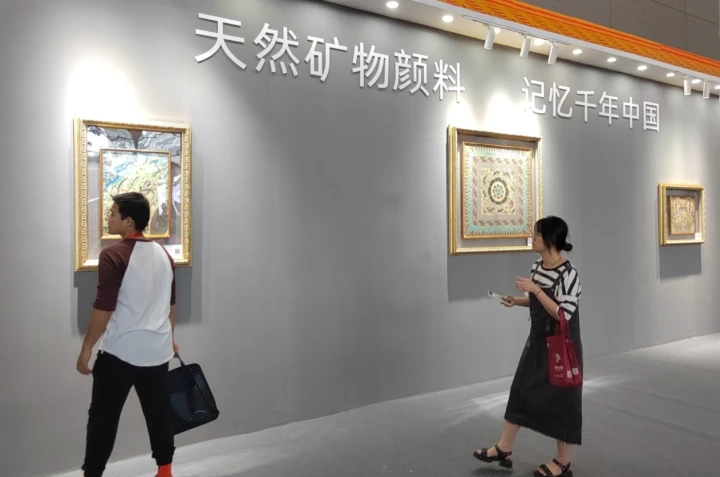 記者留意到,展覽會現(xiàn)場設(shè)有“天然礦物顏料 記憶千年中國”畫展、“溯源重生”邱楚蓮巖彩畫藝術(shù)作品展,所展出的數(shù)十幅繪畫,均使用惠州所產(chǎn)的天然礦物顏料,彩畫與彩色寶石互相輝映。