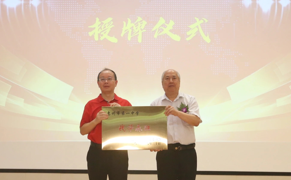 6月30日上午,錢永剛教授(右)為惠州市第一中學“錢學森班”授牌。