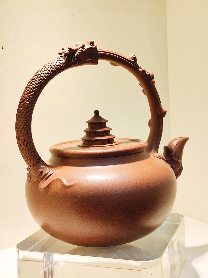 作為中華優(yōu)秀傳統(tǒng)文化的愛好者和傳播者,張德華把詩文書畫與紫砂壺陶藝結(jié)合起來,用竹刀在壺上題寫詩文、雕刻繪畫,他甚至即興設計了許多款式獨特的紫砂壺。2019年,他設計創(chuàng)作的《盛世中華》提梁壺,是以龍為圖騰,壺蓋以天壇為造型,壺梁為龍吟納水,梁上隱約紅日,茶水由龍嘴而出,形似瀑布,寓意國家繁榮昌盛,中華文脈傳承天下。