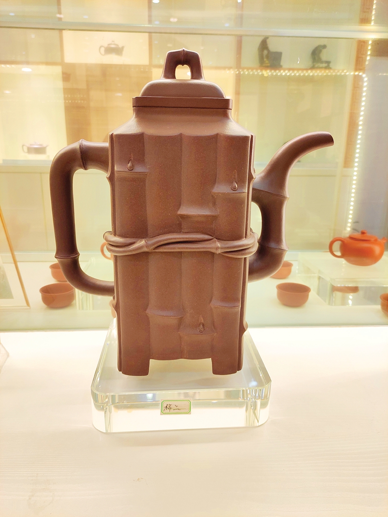 穿越巷道,走入進德堂壺藝制作中心紫砂壺展廳,猶如闖入一個藝術世界,各式紫砂壺琳瑯滿目,就像一個個健美的“模特”,形態(tài)各異。