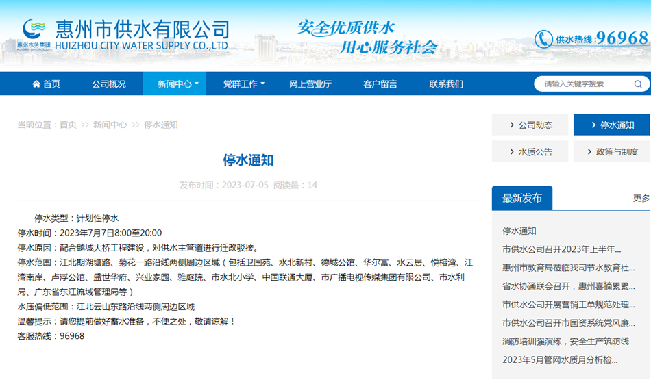 停水原因:配合鵝城大橋工程建設(shè),對(duì)供水主管道進(jìn)行遷改駁接。