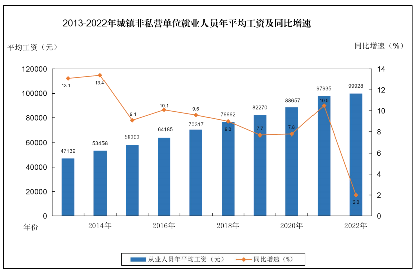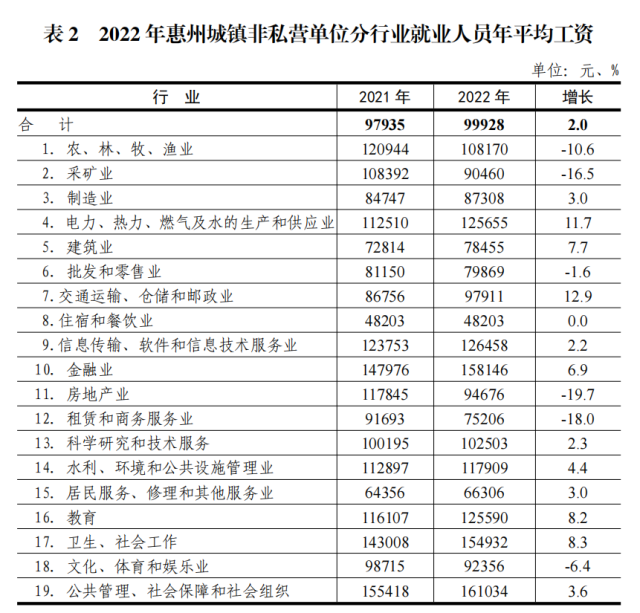 近日,惠州市統(tǒng)計局公布了2022年城鎮(zhèn)單位就業(yè)人員年平均工資情況。數(shù)據(jù)顯示,2022年,惠州市城鎮(zhèn)非私營單位就業(yè)人員年平均工資99928元,與2021年的97935元相比,增加1993元,同比增長2.0%。其中,在崗職工年平均工資101386元,同比增長2.1%。