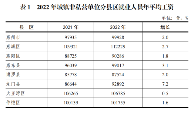 分縣區(qū)看,2022 年城鎮(zhèn)非私營單位就業(yè)人員年平均工資由高到低排列為惠城 112229 元、大亞灣 106785 元、仲愷101755 元、惠東 99017 元、龍門 92892、惠陽 90286 元、博羅 87524 元。
