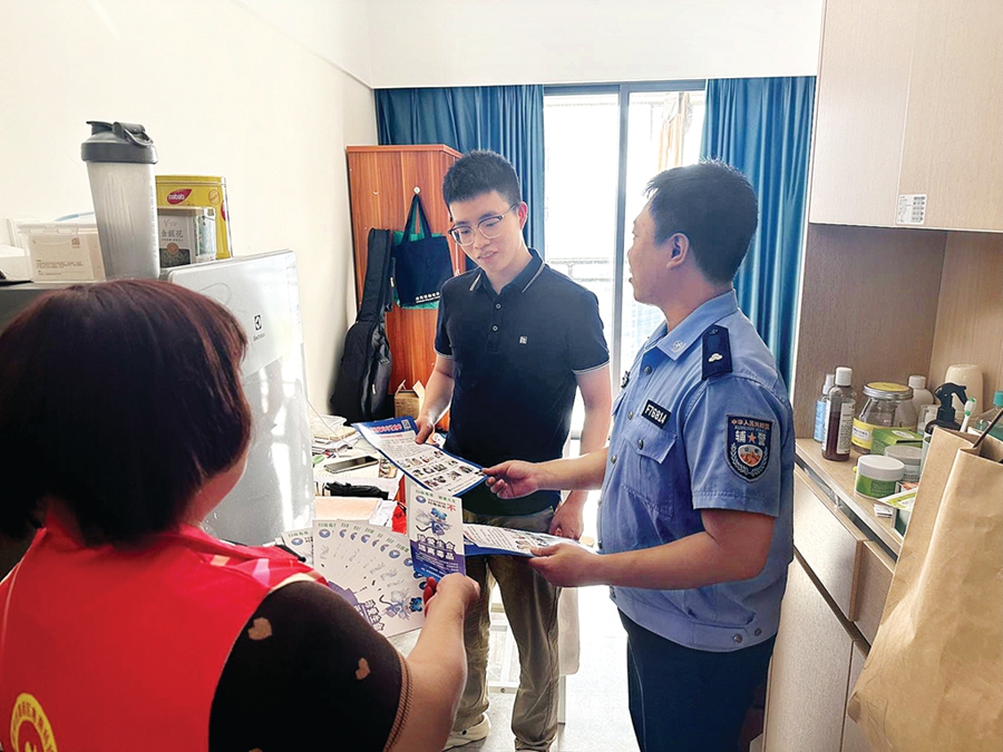 惠南科技園加強(qiáng)網(wǎng)格化管理,精細(xì)化服務(wù)群眾。這是工作人員入戶宣傳反詐知識;葜萑請(bào)記者林麗娟 攝