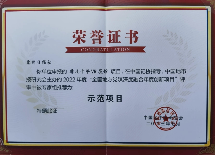 “惠州非凡十年”VR展館入選2022年度“全國地方黨媒深度融合年度創(chuàng)新項目”示范項目。該項目融合創(chuàng)新技術,創(chuàng)新運用VR技術打造云展館。以3D立體場景突破時間、地域、場地的局限,全方位展現(xiàn)惠州十年發(fā)展成就,更具互動感、現(xiàn)場感,讓觀眾體驗與互聯(lián)網(wǎng)技術的創(chuàng)新融合。