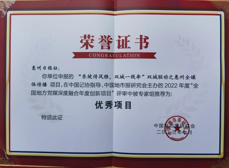 “東坡傳風雅,雙城一線牽”雙城聯(lián)動入選2022年度“全國地方黨媒深度融合年度創(chuàng)新項目”優(yōu)秀項目。該項目以東坡為紐帶,惠州日報、眉山日報聯(lián)動,全媒體平臺共發(fā)布相關稿件125篇,總閱讀量超780萬,共39萬名網(wǎng)友“云賞”兩地美景。宣傳形式新、傳播效果強。
