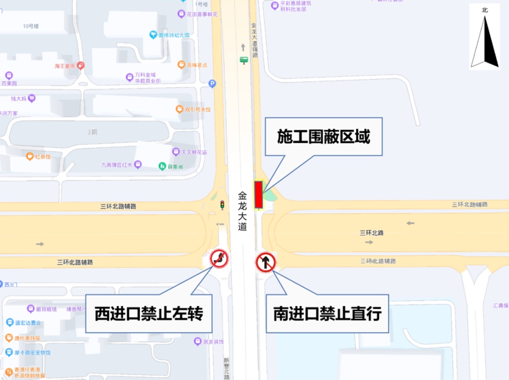 施工期間,金龍大道/三環(huán)北路輔路交叉口北出口封閉,西進(jìn)口禁止左轉(zhuǎn),南進(jìn)口禁止直行。