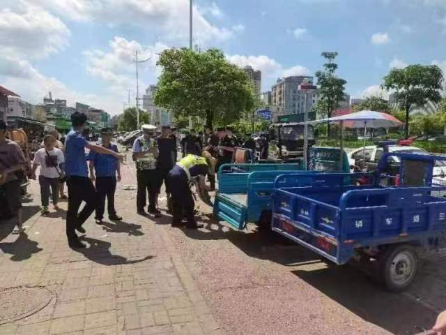 7月11日下午,針對位于居民區(qū)中心的龍湖市場周邊占道經(jīng)營、三輪貨運(yùn)車亂擺放等行為存在安全隱患、交通擁堵、衛(wèi)生臟亂差等問題,惠州市公安局交警支隊江東大隊聯(lián)合城管部門,出動執(zhí)法車輛5輛,對市場周邊的占道攤位、三輪車開展了集中勸導(dǎo)和整治工作。