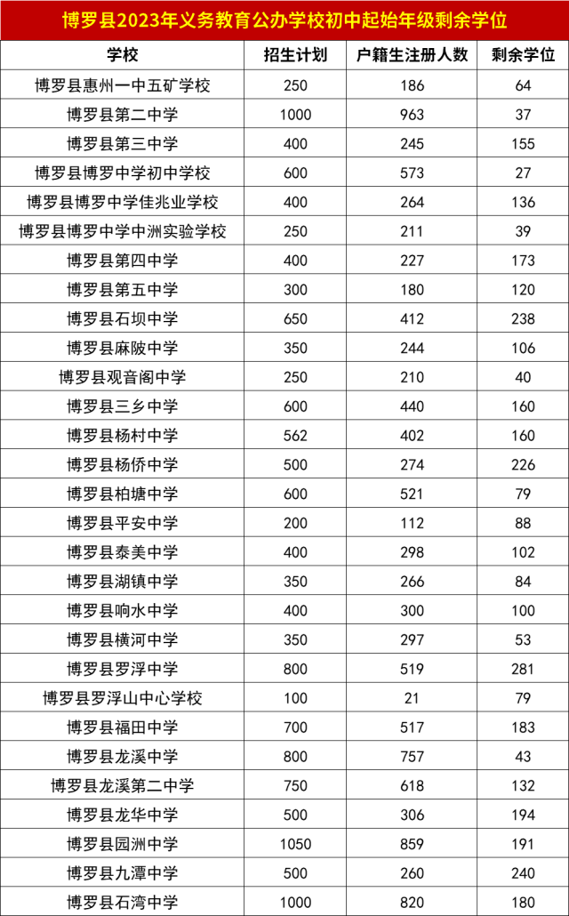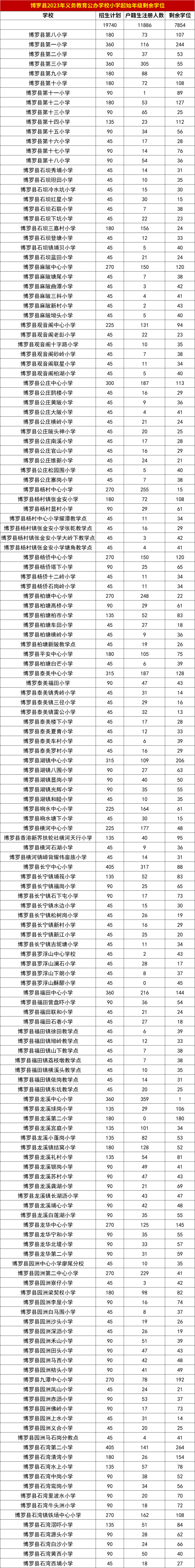 根據(jù)《博羅縣2023年義務(wù)教育招生入學(xué)工作指引》,7月8-9日已完成2023年義務(wù)教育公辦學(xué)校戶籍生注冊工作,現(xiàn)將各學(xué)校剩余學(xué)位向社會、家長公布,請家長、學(xué)生根據(jù)剩余學(xué)位情況選擇填報積分入學(xué)學(xué)校,每個參與積分學(xué)生可在同一鎮(zhèn)(街道)填報三所學(xué)校,其中第一志愿為居住地所在學(xué)區(qū)學(xué)校。