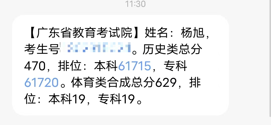 楊旭是惠州市實驗中學(xué)2023屆的體育特長生,在今年的高考中,取得了非常優(yōu)異的成績,廣東體育術(shù)科統(tǒng)考294分,高考總分629分,全省排名19名!
