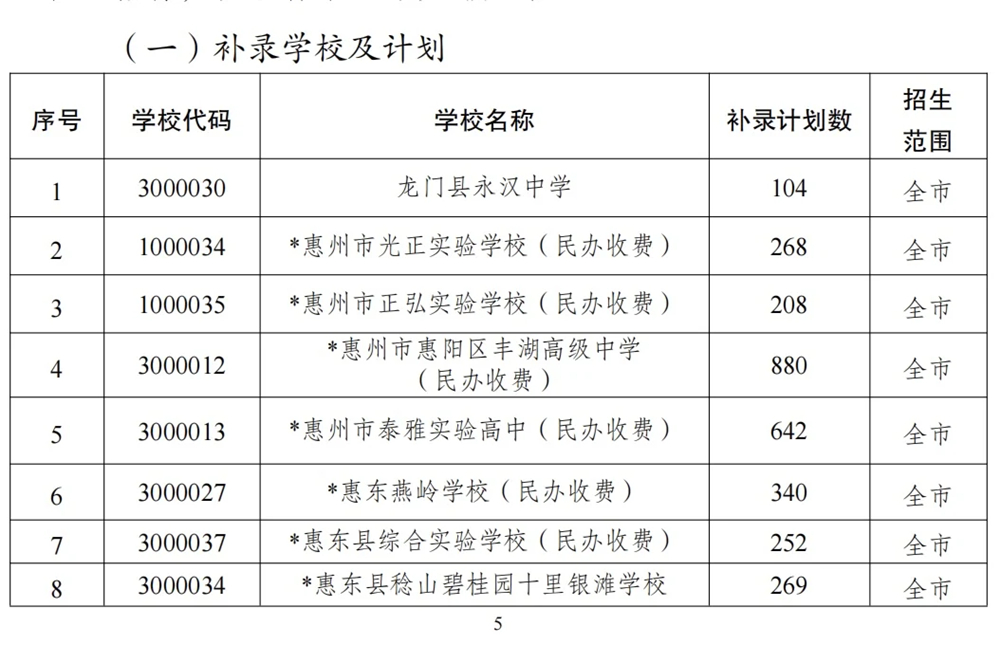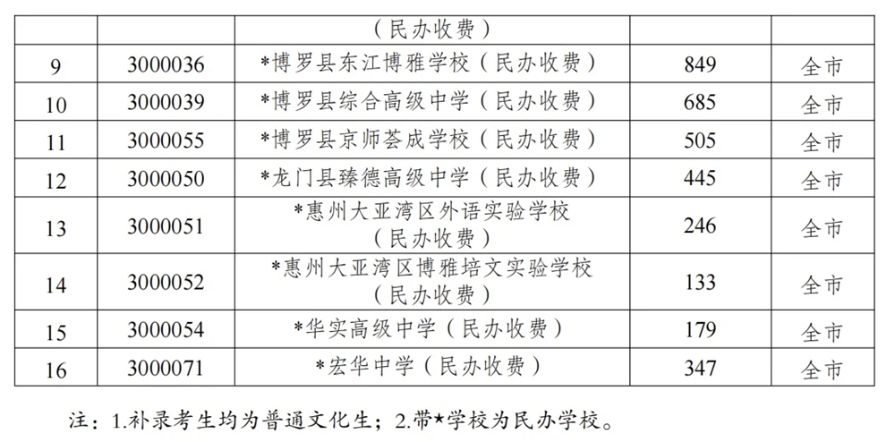 在今年參與補錄的16所普通高中學(xué)校共計劃補錄6352人。龍門縣永漢中學(xué)唯一的公辦學(xué)校,其余15所均為民辦學(xué)校。補錄對象為在惠州市參加2023年中考的考生,如考生在普通高中各批次中均未被惠州普通高中學(xué)校錄取,且中考成績(含政策性加分)在450分及以上,即可參加補錄。符合補錄條件且自愿選擇參加補錄的考生須按流程填報補錄志愿,符合補錄條件但未填報補錄志愿的考生不能參與補錄。補錄共設(shè)置6個志愿欄,根據(jù)考生“分數(shù)優(yōu)先、志愿先后”原則,統(tǒng)一進行劃線錄取。
