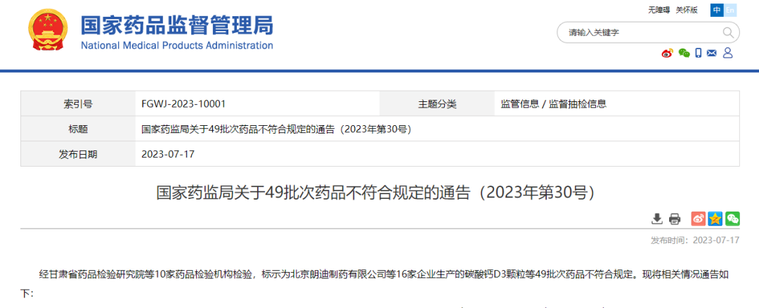 7月17日,國家藥監(jiān)局網(wǎng)站發(fā)布關于49批次藥品不符合規(guī)定的通告。