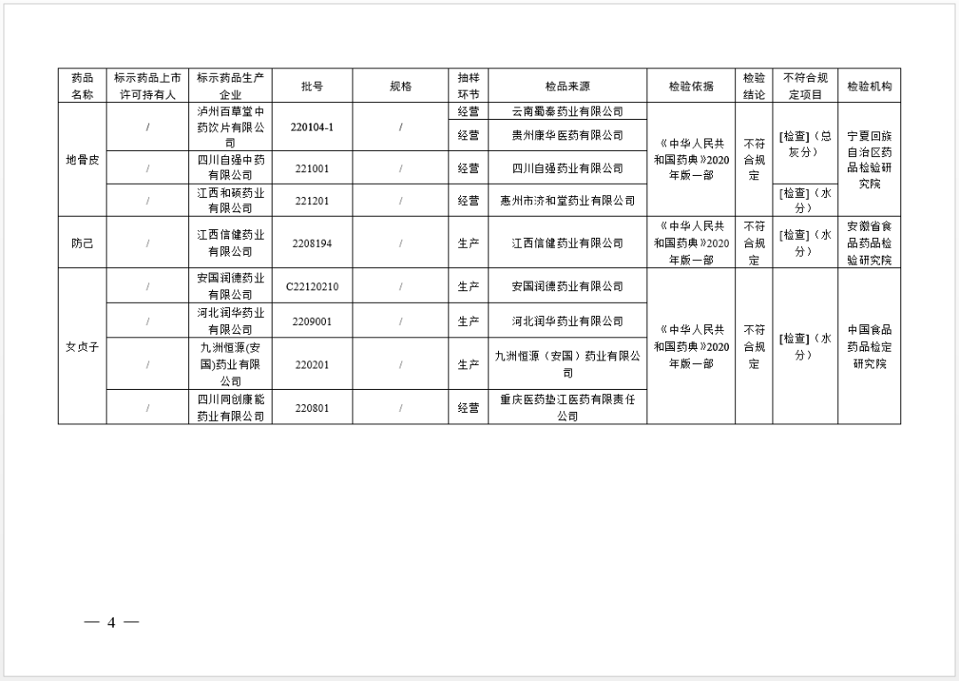 經(jīng)中國食品藥品檢定研究院檢驗,標示為安國潤德藥業(yè)有限公司、河北潤華藥業(yè)有限公司、九洲恒源(安國)藥業(yè)有限公司、四川同創(chuàng)康能藥業(yè)有限公司生產(chǎn)的4批次女貞子不符合規(guī)定,不符合規(guī)定項目為水分。