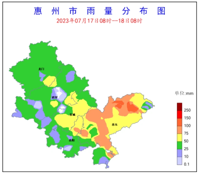 17日8時(shí)~18日8時(shí),全市平均雨量43.2毫米,有2個(gè)站點(diǎn)錄得100~250毫米累積雨量,有48個(gè)站點(diǎn)錄得50~100毫米累積雨量,有71個(gè)站點(diǎn)錄得25~50毫米累積雨量,各縣區(qū)最大降水量分別為:惠東寶口107.9毫米、惠陽(yáng)良井90.2毫米、惠城河南岸76毫米、龍門(mén)龍江59.5毫米、博羅泰美58.4毫米、仲愷惠環(huán)52.9毫米、大亞灣澳頭37.1毫米。