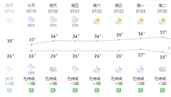惠州市氣象臺(tái)7月18日14時(shí)發(fā)布惠州一周天氣趨勢(shì),受臺(tái)風(fēng)“泰利”殘余環(huán)流影響,7月18日白天我市南部有大雨到暴雨,其余地區(qū)中到大雨;19日,中到大雨,26~31℃;20日,多云,有雷陣雨,26~32℃;21~23日,多云,局部有雷陣雨,26~34℃;24日,多云,有雷陣雨,26~34℃;展望25日起受熱帶氣旋影響,有一次風(fēng)雨過(guò)程。