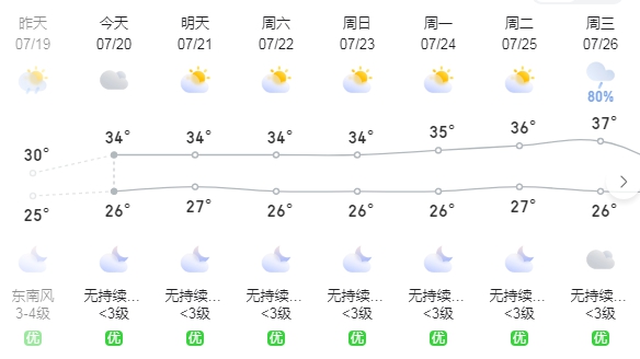 市氣象臺預計,未來3天我市降雨趨于減弱,以雷陣雨為主,天氣趨于炎熱。具體來說,7月20日,我市天氣多云到陰天,有雷陣雨局部大雨,26~33℃;21日,多云,局部有雷陣雨,27~34℃;22日,多云,局部有雷陣雨,27~35℃。