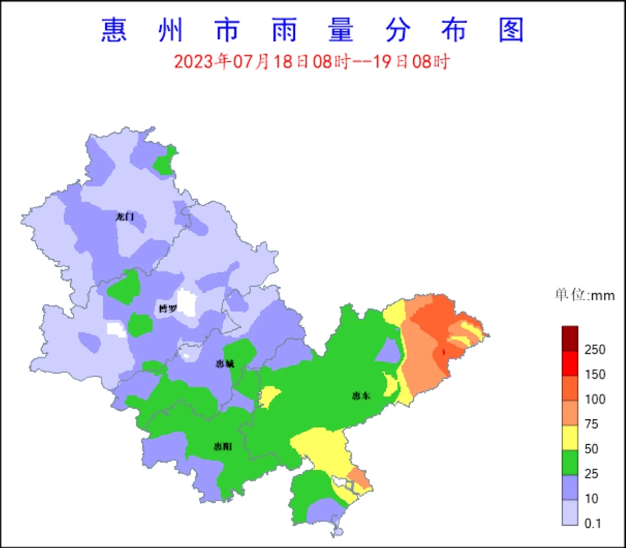 市氣象臺介紹,7月18日8時~19日8時,我市南部有大雨到暴雨局部大暴雨,中北部有中到大雨局部暴雨,全市平均雨量21.4毫米,有3個站點錄得100~250毫米累積雨量,有10個站點錄得50~100毫米累積雨量,有45個站點錄得25~50毫米累積雨量,各縣區(qū)最大降水量分別為:惠東高潭153.1毫米、惠城河南岸51.7毫米、大亞灣澳頭47.3毫米、惠陽沙田42.1毫米、仲愷潼僑37.3毫米、博羅湖鎮(zhèn)26.9毫米、龍門龍?zhí)?6毫米。