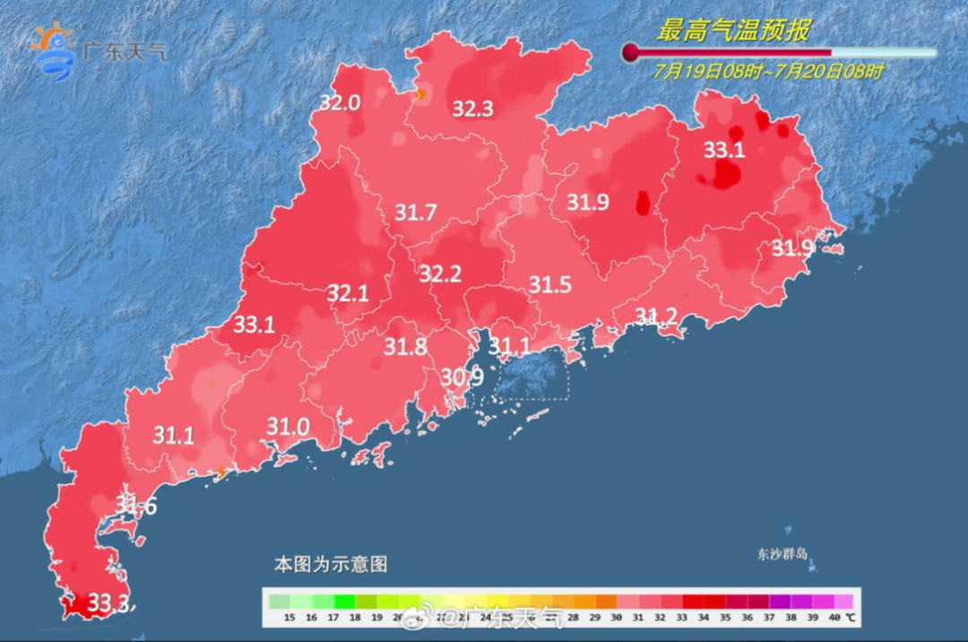 20日,粵西和珠江三角洲市縣多云,有分散(雷)陣雨局部大雨,其余市縣多云,局部有(雷)陣雨。最高氣溫:粵北和珠江三角洲北部市縣31℃~34℃,其余市縣29℃~31℃。