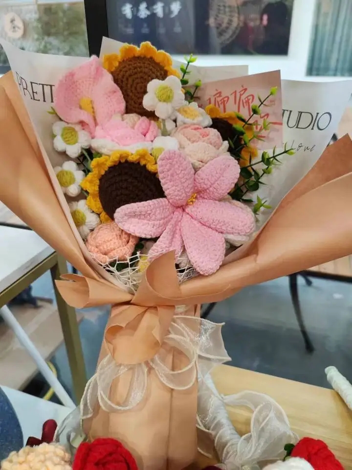 李喜玲經(jīng)營(yíng)著家居用品生意,但一旦拿起鉤針,隨著針線舞動(dòng),心就沉靜下來,“編織讓我特別平靜,就像回到兒時(shí)的時(shí)光!比缃,她不僅擅長(zhǎng)編織各式花草,還能鉤織出各式萌萌的卡通人物、家居用品等。“家里的花瓶、果盆、靠墊等全部是我編織的,看著它們,心里就特別幸福!崩钕擦嵴f,女兒大學(xué)畢業(yè)時(shí),她專門為女兒編織了一束小香風(fēng)玫瑰花,還給女兒全班同學(xué)編織向日葵胸花,大家都很羨慕女兒。