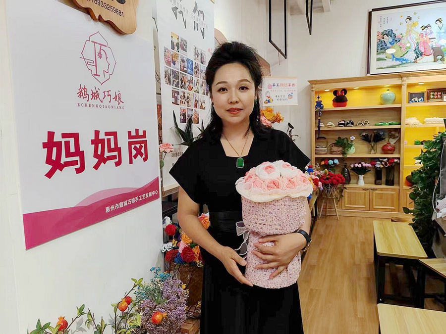 當(dāng)焦艷紅看到2022年北京冬奧會(huì)上使用的頒獎(jiǎng)花束——“永不凋謝的奧運(yùn)之花”,是采用中國(guó)的非物質(zhì)文化遺產(chǎn)“海派絨線編結(jié)技藝”手工制作而成時(shí),她不僅被毛線鉤編花的美所吸引,也敏銳地感覺到毛線鉤編藝術(shù)品的市場(chǎng)。她發(fā)起成立了惠州市鵝城巧娘手工藝發(fā)展中心,開始毛線鉤編的培訓(xùn)推廣。