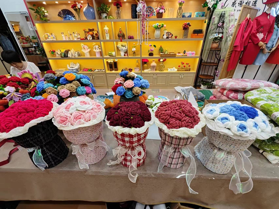 “這個(gè)玫瑰花的配色太小眾了”“你看,把花瓣都展開來,花束的感覺就不一樣了”……在惠州市鵝城巧娘手工藝發(fā)展中心,焦艷紅思索著如何包裝毛線鉤編成品,她是這個(gè)中心的“頭部”。焦艷紅學(xué)服裝設(shè)計(jì)出身,經(jīng)營(yíng)著自創(chuàng)品牌服裝,2021年開始,她就關(guān)注到毛線鉤編技藝。