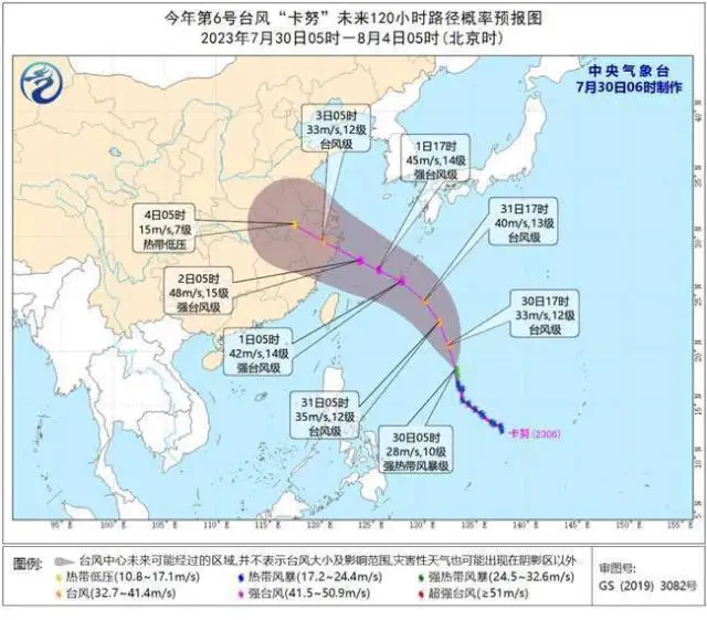 預(yù)計,“卡努”將以每小時20~25公里的速度向北偏西方向移動,31日在琉球群島附近海域轉(zhuǎn)向西北方向移動,31日夜間至8月1日早晨進入東海,逐漸向浙江沿?拷瑥姸戎饾u增強,最大強度可達強臺風級(45~50米/秒,14~15級)。