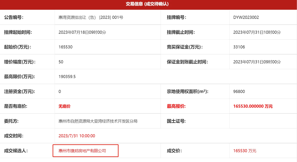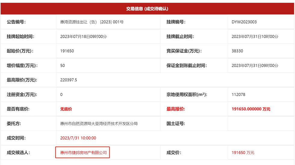 7月31日,大亞灣西區(qū)兩宗商住用地成功出讓?zhuān)换葜菔薪莅罘康禺a(chǎn)有限公司以35.72億元競(jìng)得,占地面積20.89萬(wàn)㎡,最高建面62萬(wàn)㎡,折合地面價(jià)約17100元/㎡,樓面價(jià)約5700元/㎡。這是今年以來(lái)大亞灣區(qū)首次掛牌商住用地。根據(jù)愛(ài)企查得知,惠州市捷邦房地產(chǎn)有限公司為恒力集團(tuán)100%控股子公司。
