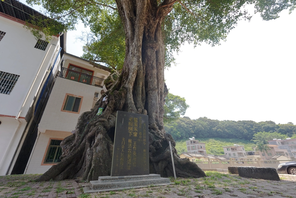 關(guān)于這棵榕樹,還有一個故事。故事被刻在樹下的一塊石碑上,上寫著“鰲溪禾輋,老榕樹下——王作堯開倉帳濟農(nóng)民遺址”,講的就是當年東江縱隊副司令員王作堯率領(lǐng)部隊挺進麻榨鰲溪地區(qū),在老榕樹下攻破敵人糧倉,接濟農(nóng)民的歷史故事。