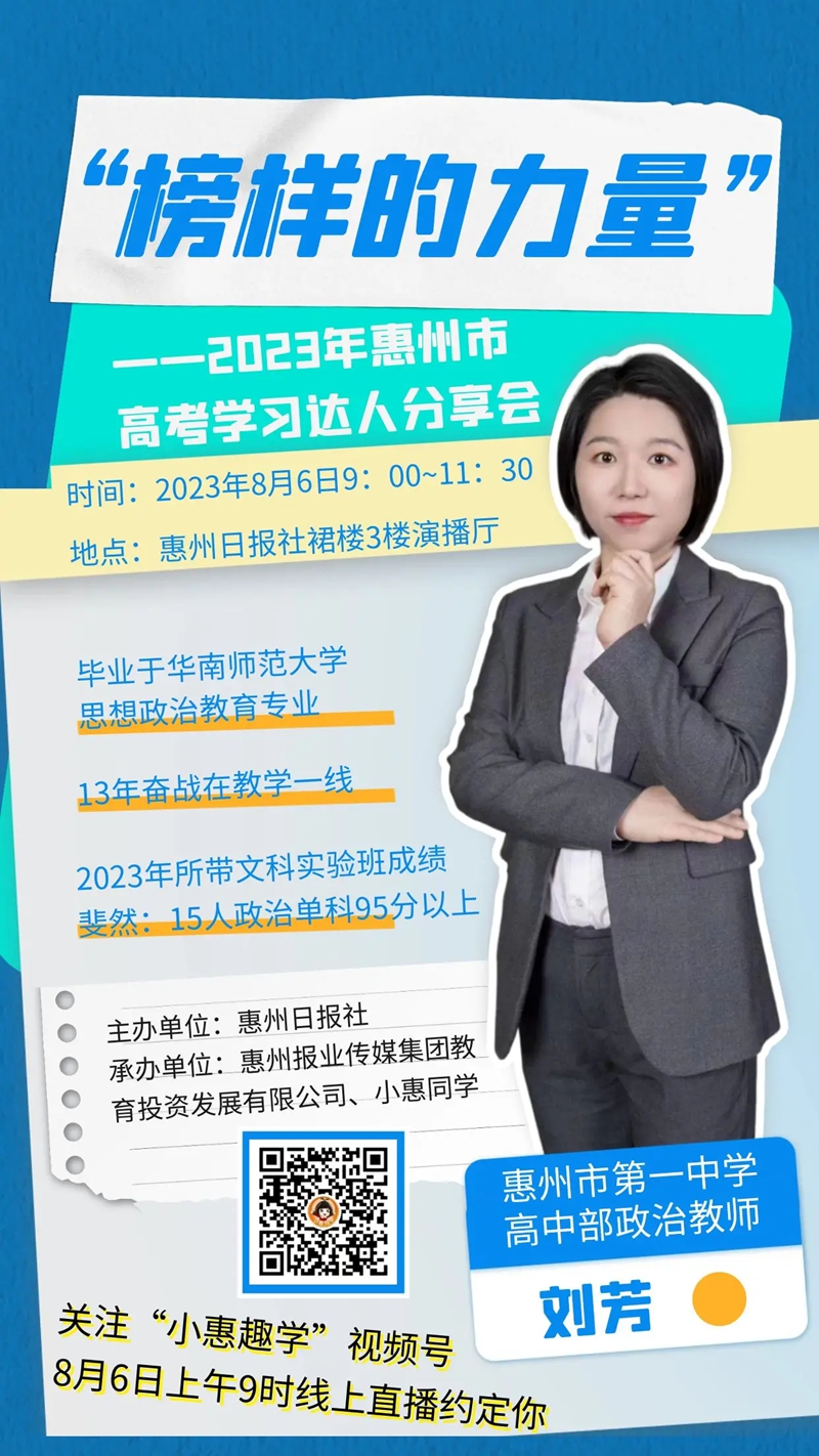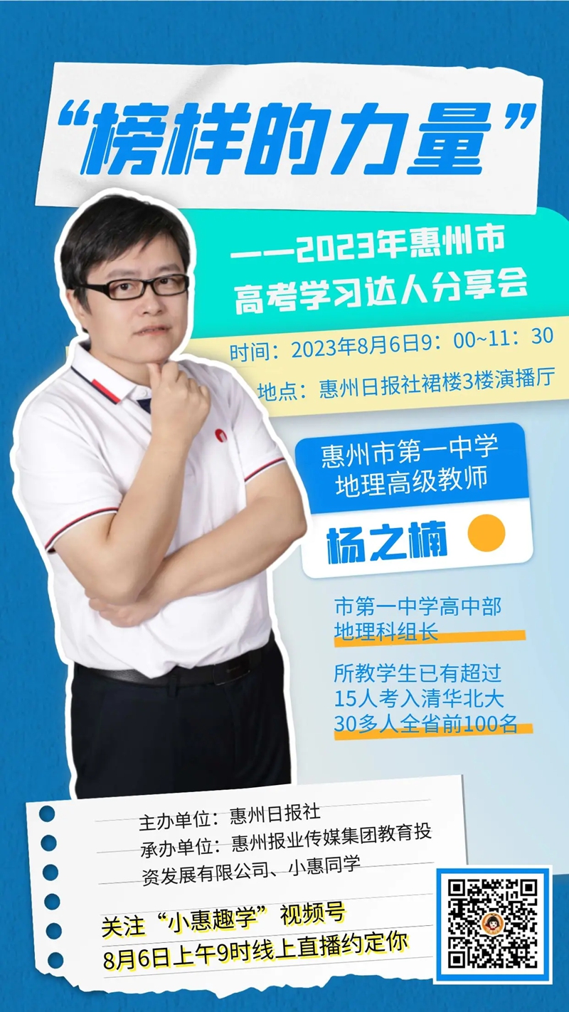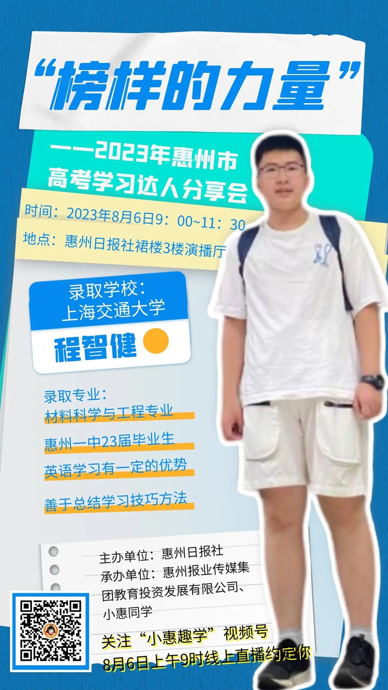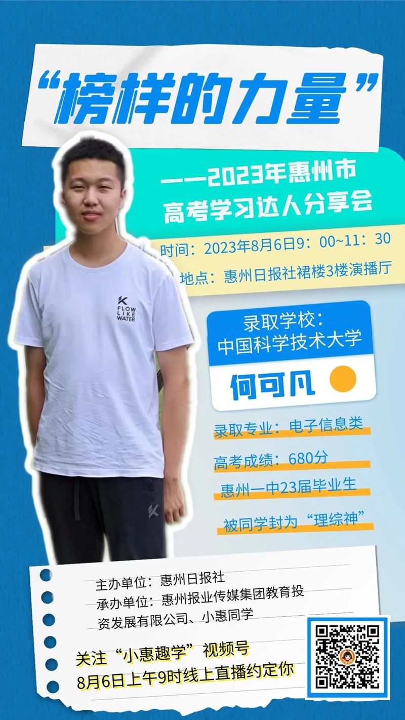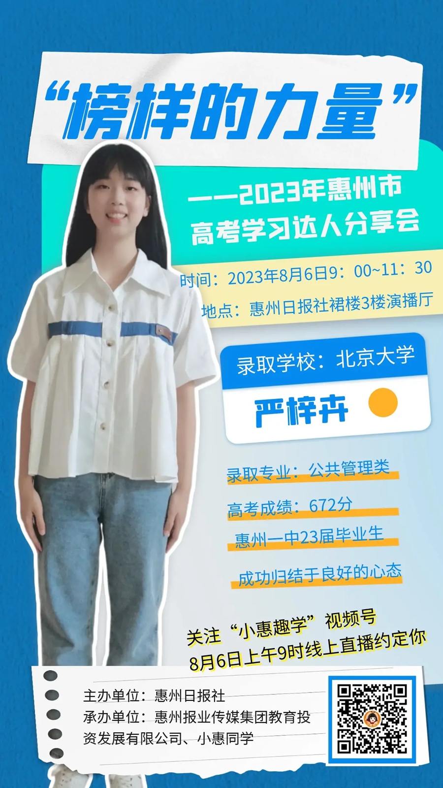 對(duì)于黃一立和其他高分學(xué)長學(xué)姐們的高考故事,我們將在“榜樣的力量”——2023年惠州市高考學(xué)習(xí)達(dá)人分享會(huì)上與各位家長同學(xué)們進(jìn)行現(xiàn)場交流,分享會(huì)設(shè)有問答環(huán)節(jié)。