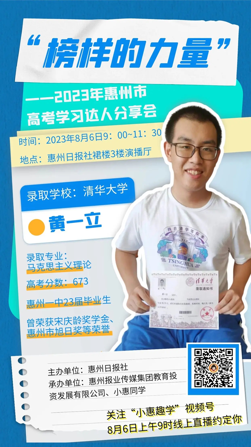 “榜樣的力量”——2023年惠州市高考學(xué)習(xí)達(dá)人分享會(huì)將于8月6日早上9時(shí)開啟,屆時(shí)將以線下參會(huì)和線上直播的方式進(jìn)行。本次邀請(qǐng)了4位高考學(xué)習(xí)達(dá)人前來分享高分秘笈。主講嘉賓之一、今年惠州首個(gè)拿到清華大學(xué)錄取通知書的黃一立同學(xué)備受關(guān)注,讓我們先來聽聽他的高考故事。
