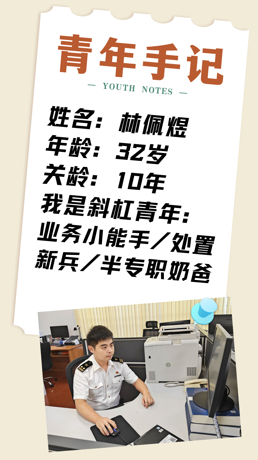 我是惠州海關(guān)駐淡水辦事處監(jiān)管一科的林佩煜,今年是我進入海關(guān)工作的第十個年頭。十年來,我從事過碼頭監(jiān)管、加貿(mào)保稅、辦公綜合、機要保密、人事政工、后續(xù)稽查、綜合業(yè)務(wù)以及后續(xù)處置等工作,豐富的工作經(jīng)歷也給我?guī)砹素S富的業(yè)務(wù)知識。
