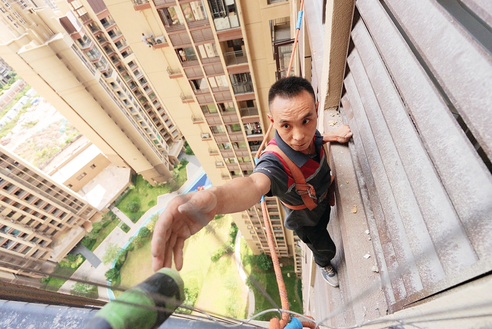 王德權在空調外機位上忙活,阿海也沒有停下來,他通過繩索為王德權輸送空調外機以及安裝所要用到的各種工具,并時刻關注安全繩和王德權的情況,“一起出來干活的,就要一起回去!