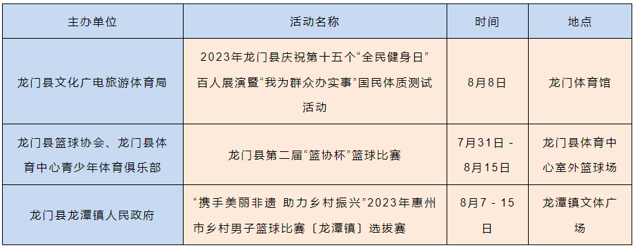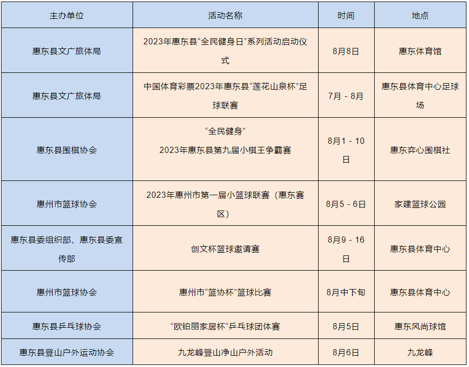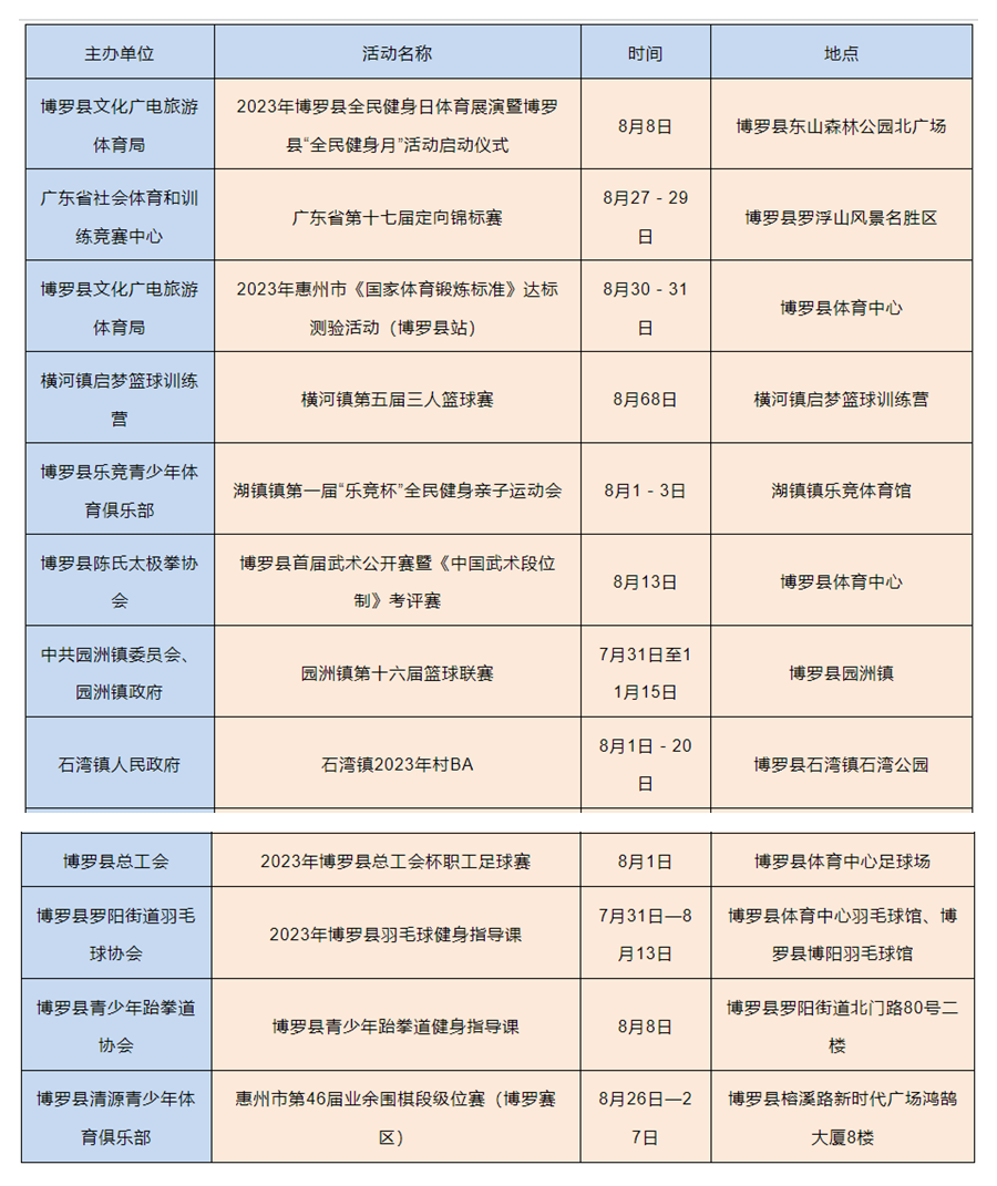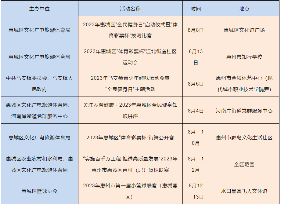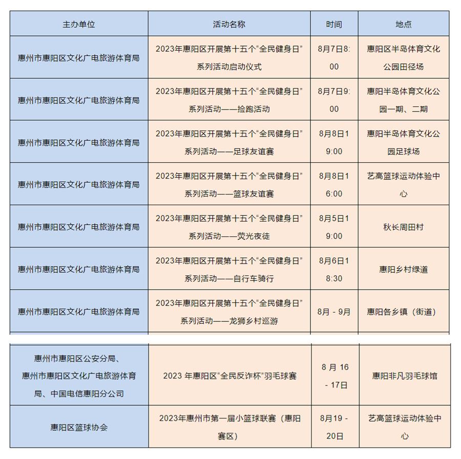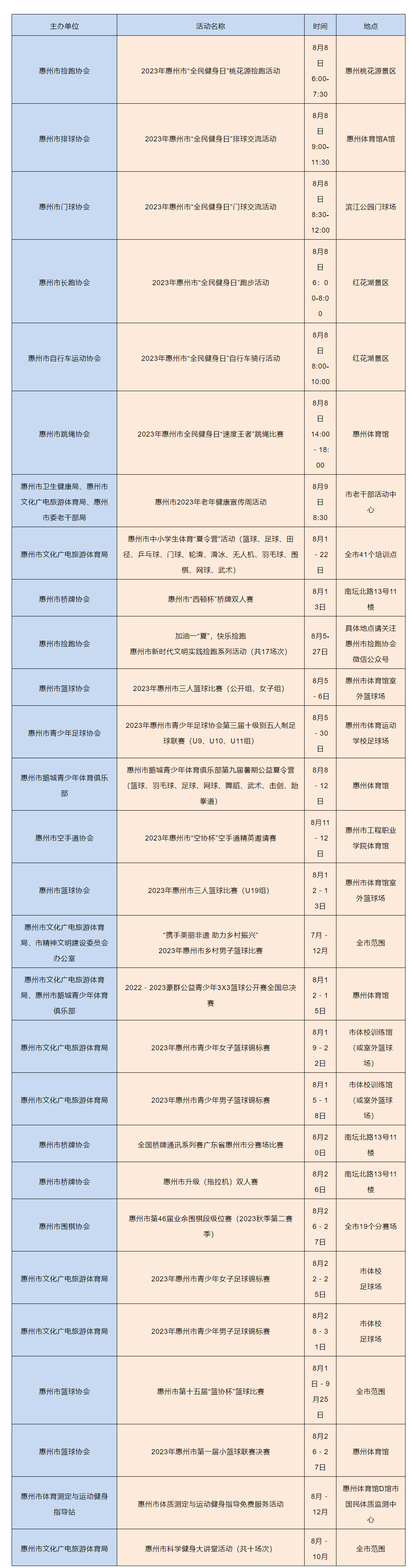 2023年8月8日是我國第15個(gè)“全民健身日”,8月8日所在周(8月7日至13日)是我國第一個(gè)“體育宣傳周”。記者從市文廣旅體局獲悉,8月8日前后,我市將以“全民健身 繪就幸福生活”為主題舉辦一系列體育賽事活動。整個(gè)8月,將會有100多高品質(zhì)體育賽事活動輪番上演,賽事內(nèi)容涵蓋了足球、籃球、登山、徒步、自行車等廣大市民喜聞樂見、踴躍參與的項(xiàng)目。同時(shí),我市還將開展撿跑公益志愿服務(wù)和科學(xué)健身指導(dǎo)活動,用豐富多彩的健身展演、健身服務(wù)和賽事活動把健康、快樂送進(jìn)千家萬戶,讓惠州市民充分感受到全民健身的濃厚氛圍。